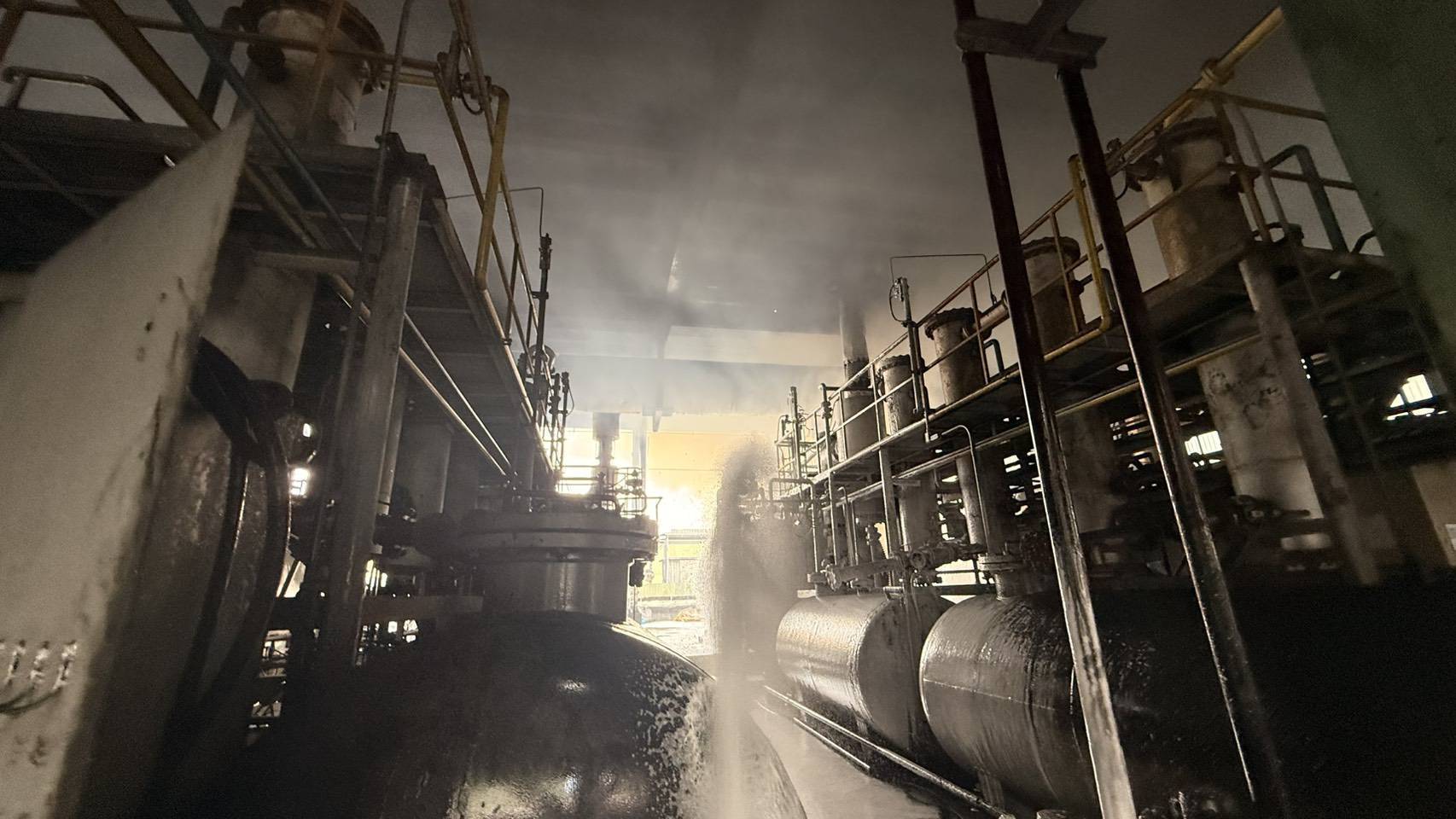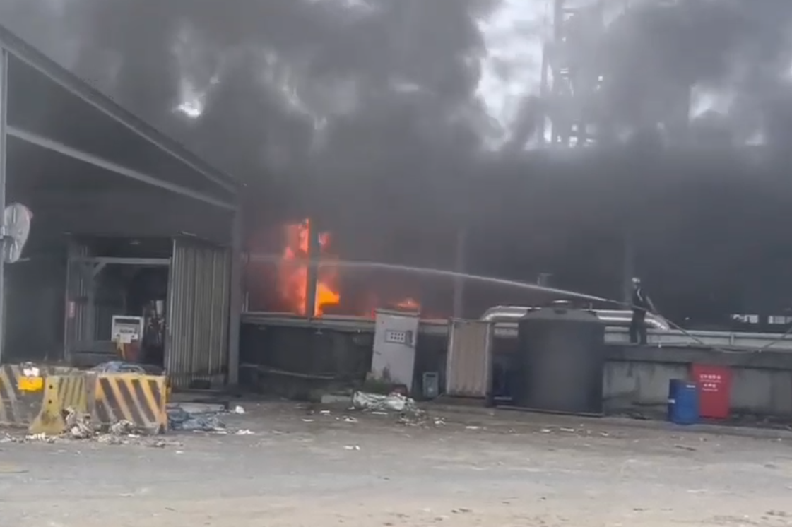 消防隊員朝起火橡膠裂解爐灌救。翻攝畫面