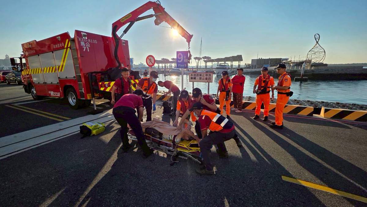 消防隊員將墜海民眾抬上擔架送上救護車。翻攝畫面