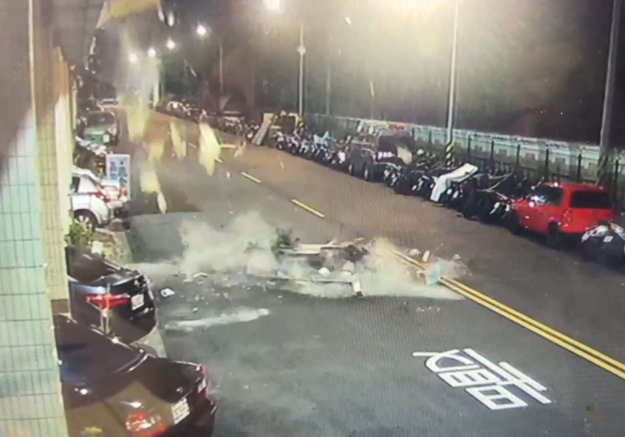 住戶表示,今天凌晨多聽到屋外發出轟然巨響,趕緊衝出查看,發現竟然是4樓住戶的陽台崩落,路面上一大堆碎裂的磚塊,令人怵目驚心,事後調閱監視器畫面查看,發生時恰巧有1輛車經過,所幸未砸中,僅砸壞樓下3樓的雨遮和鐵窗。