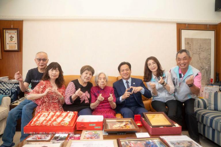▲代理市長邱臣遠重陽節前夕前往拜訪百歲人瑞羅書惠奶奶,與羅奶奶及家人合影。(圖/記者張建奎攝)