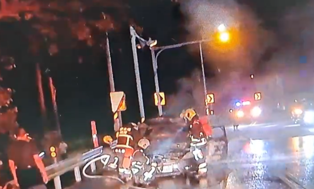 10月18日17時58分,苗栗縣消防局獲報三灣鄉三灣村三灣14-1號旁邊自小客車起火,出動三灣分隊2車5人,由小隊長廖祥帆帶隊前往灌救。