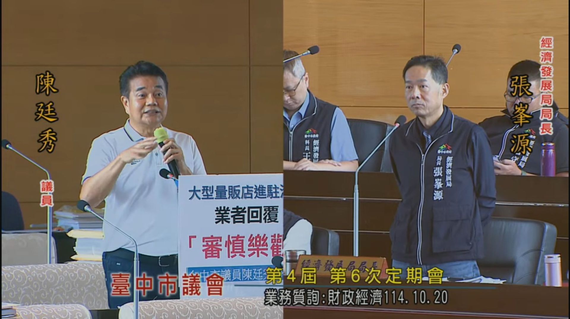 ▲ 台中市無黨籍議員陳廷秀,於今(20)日議會「財政經濟」業務質詢時間提出「大型量販店進駐港區 業者回覆審慎樂觀!」為議題,詢問經發局長張峯源實景。(圖/記者游穎達 中市議會傳真)