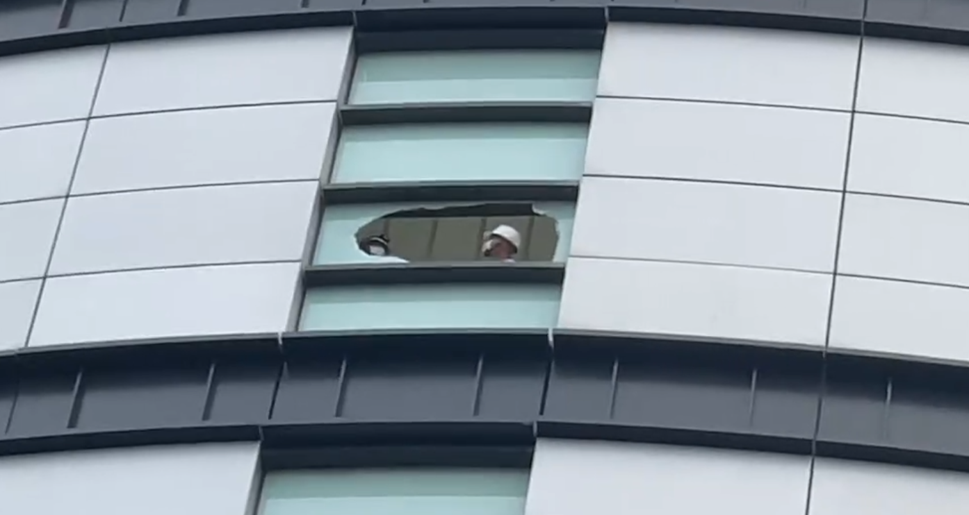 台中新光三越百貨8樓玻璃幕被強風吹起異物砸破一個大洞。翻攝畫面