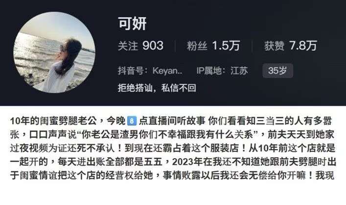 可妍指出,10年的閨蜜劈腿老公,她目前已經跟老公離婚,閨蜜還嗆說「妳老公是渣男妳們不幸福跟我有什麼關係」,前夫天天到她家過夜,影片為證還死不承認!到現在還霸佔著這個服裝店!從10年前這個店就是一起開的,每天進出賬全部都是五五,2023年在她還不知道閨蜜跟前夫劈腿,「出於閨蜜情把這個店的經營權給她,事情敗露以後我還會無償給你開嗎!」