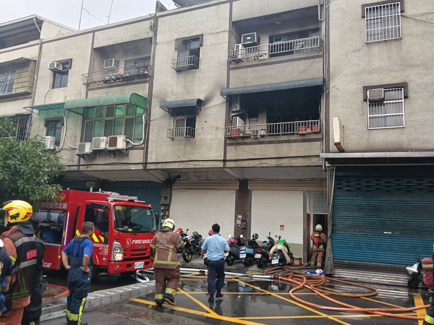 新莊4樓民火警濃煙竄出,消防隊員架梯救援。翻攝畫面
