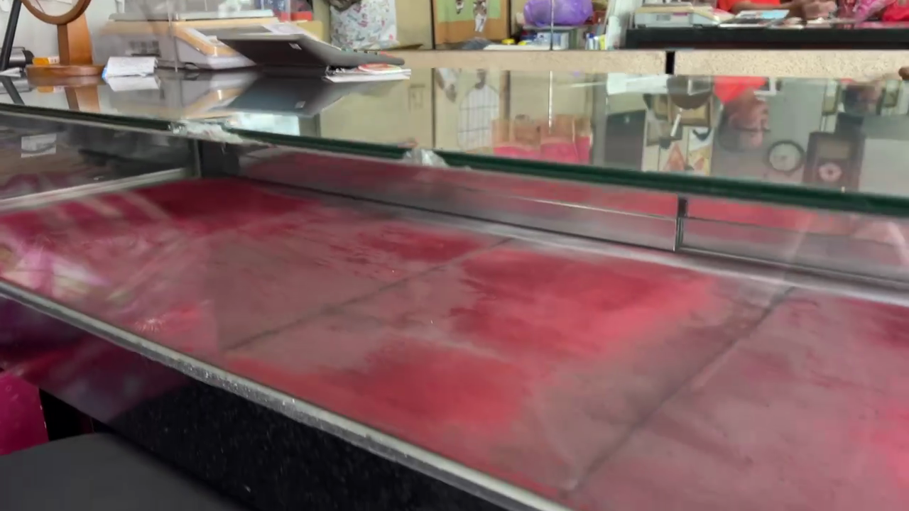 ▲▼店內其餘金飾即遭砸的玻璃櫃(圖/記者王俊勝 翻攝)