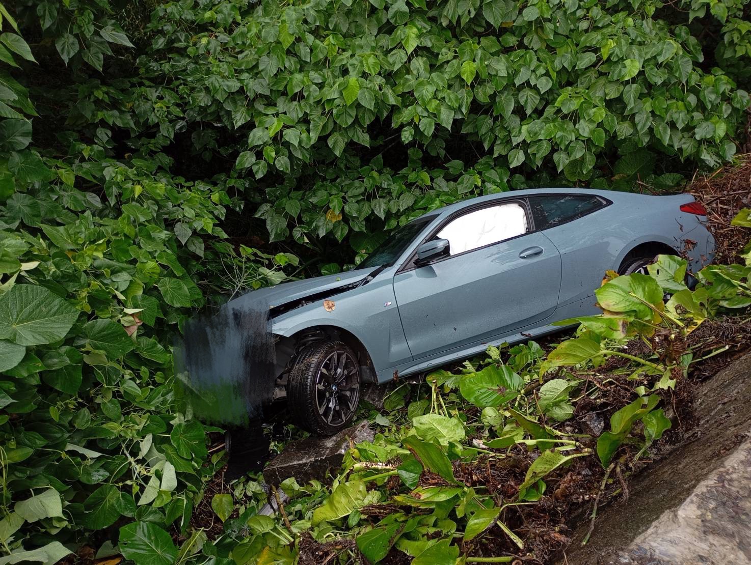 北投BMW男彎道失控翻落邊坡 幸運脫困無傷仍苦笑:怕被朋友笑技術太差.(圖/翻攝)