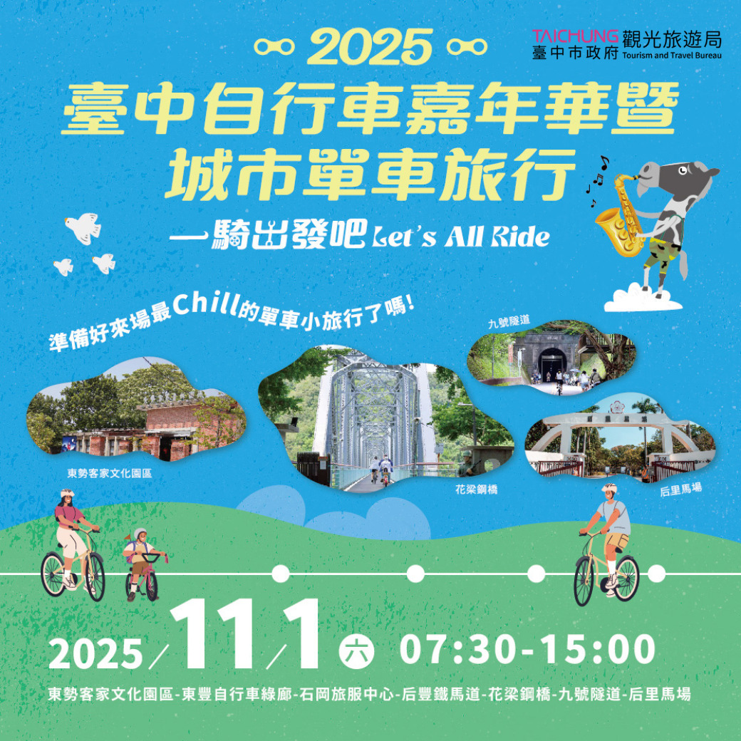 「2025台中自行車嘉年華」將於本周六(11月1日)在「東勢客家文化園區」及「后里馬場」熱鬧登場,預計吸引超過1,700位市民朋友與各地遊客熱情參與,一同騎行台中最經典的自行車路線—「東后豐自行車綠廊」,沿途行經「0蛋月台」、「大甲溪花梁鋼橋」及「九號隧道」等著名景點,終點「后里馬場」現場並規劃美食市集、在地樂團、兒童劇團與街頭藝人帶來精彩演出,邀請民眾一同感受今年秋日最chill的慢旅魅力!