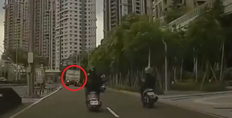 機車與大貨車相撞倒地(紅圈處)。翻攝畫面