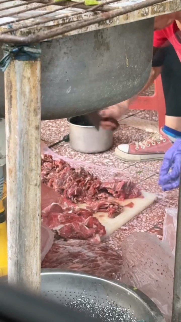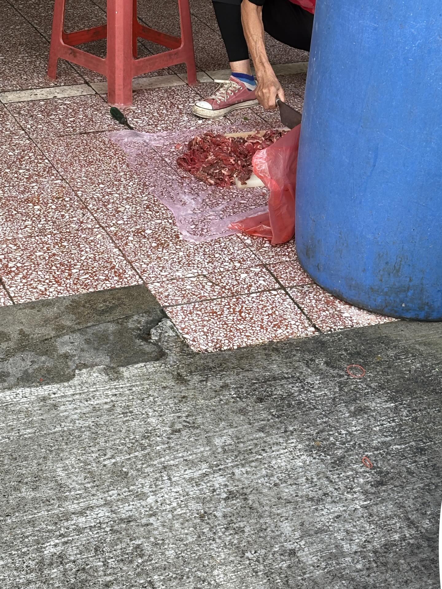 網友在Threads發文指出,看到台南市青年路老泰羊肉,員工在地上切肉,還好幾度把地上的肉撿起來。有網友留言問如何證明這是老泰羊肉,原po也說,可以去對一下地板磁磚的紋路、藍色桶子的擺放位置等等。