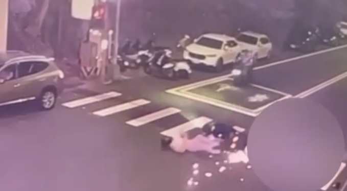 機車騎士撞擊行人後連人帶車倒地。翻攝畫面