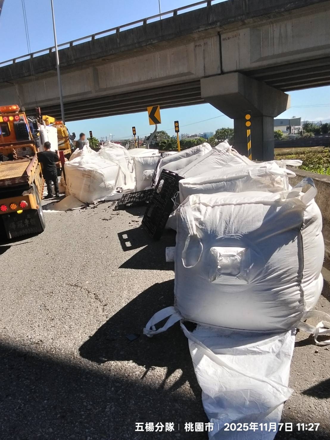 【Lai傳媒、記者爆料網/周庭慶/桃園報導】國道2號今(7)日發生掉落物影通行事故!上午10時54分左右,國道警察第一大隊接獲通報,國道2號東向大竹交流道東往北匝道內,有大量太空包掉落,立刻調派巡邏車前往查看,並通知工務段。經查,58歲程姓男子駕駛大貨車載運太空包,行經國道2號東向大竹交流道東往北匝道,疑似因車上所載運之太空包未綑紮牢固,導致車輛在過彎時共有12個太空包掉落在車道上,所幸並未造成其他事故發生,12時23分排除。